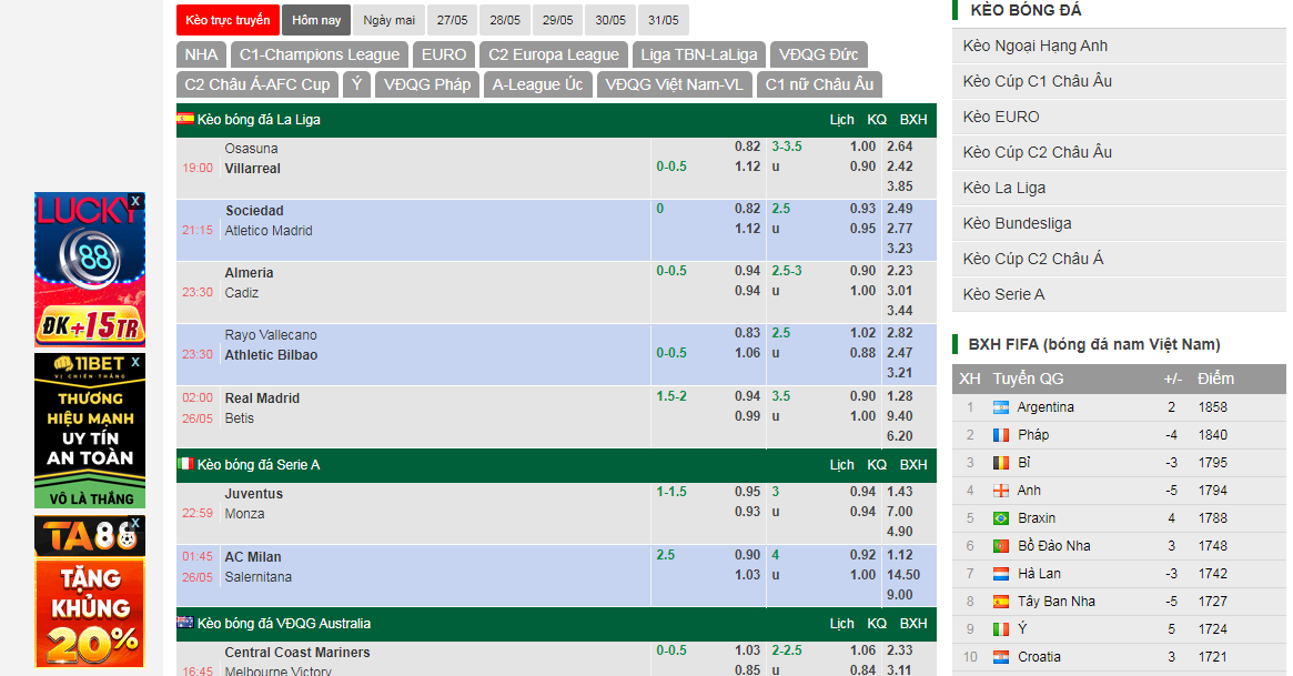 Tham khảo bảng tỷ lệ kèo từ nhiều nhà cái